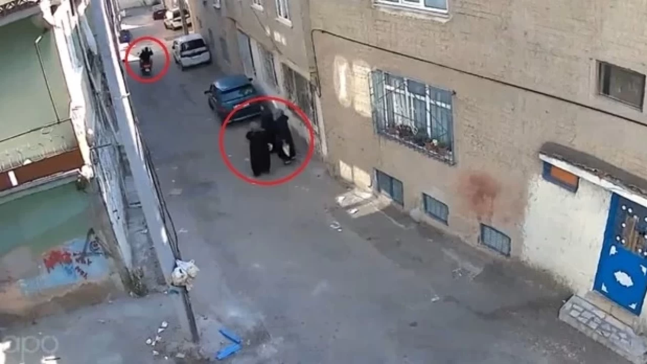 K.A.'nın sırt çantasının motosikletli iki şüpheli tarafından kapkaç yöntemiyle çalındığı anlar, sokak üzerinde bulunan bir evin güvenlik kamerasına saniye saniye yansıdı.