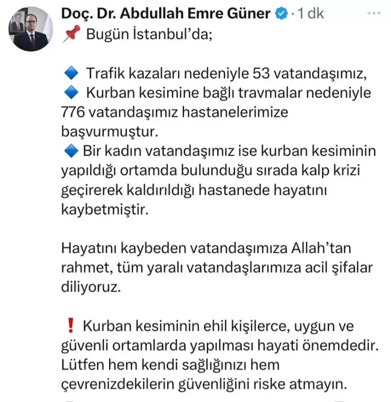 Doç. Dr. Abdullah Emre Güner, sosyal medya hesabından yaptığı açıklamada, İstanbul'da meydana gelen trafik kazaları sonucunda 53 vatandaşın yaralandığını belirtti. Aynı zamanda 776 kişinin de kurban kesimi esnasında travmalar yaşayarak hastanelere başvurduğunu ifade etti. Bu acı verici durumlara ek olarak, bir kadın vatandaşın kurban kesimi sırasında kalp krizi geçirerek hayatını kaybettiğini bildirdi.