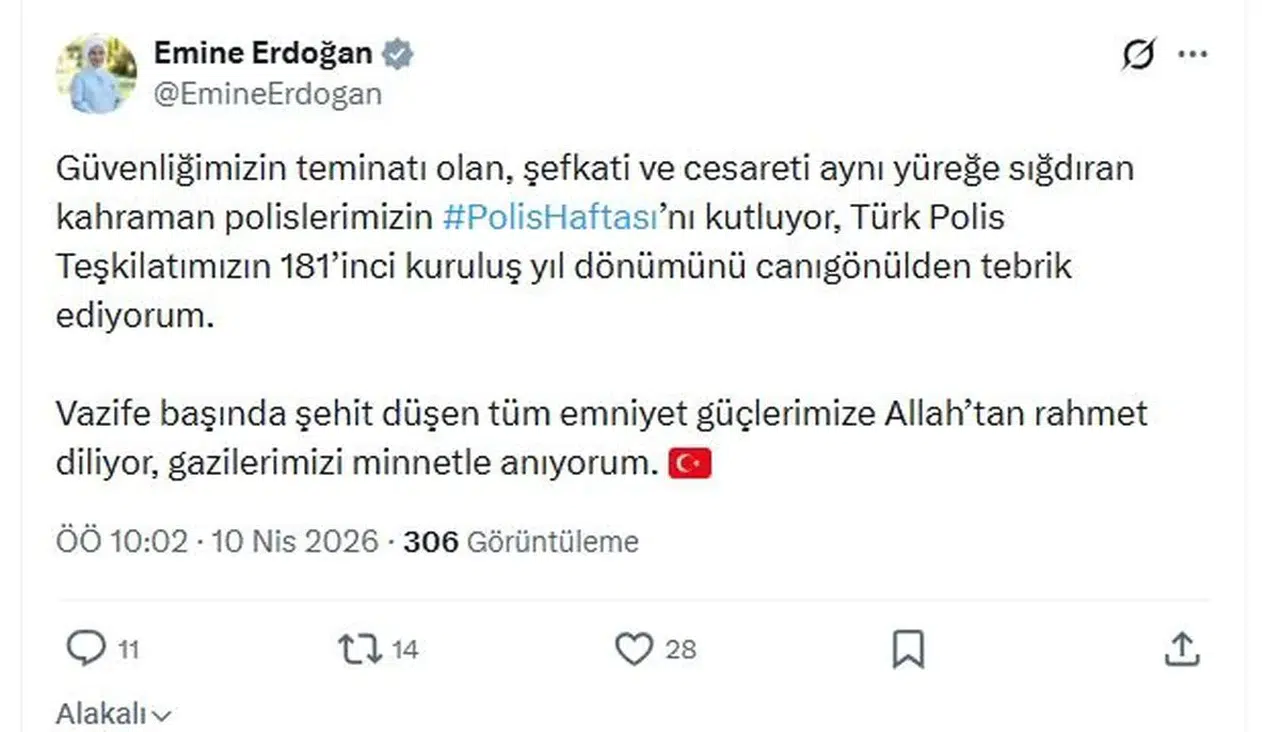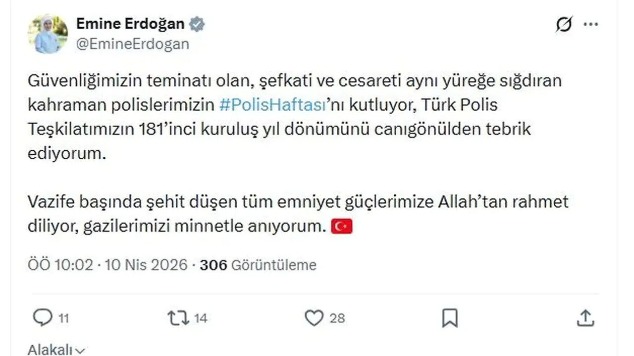 Emine Erdoğan, mesajında güvenlik güçlerinin toplum için taşıdığı öneme dikkat çekerek polislerin fedakârlık ve cesaretine vurgu yaptı.