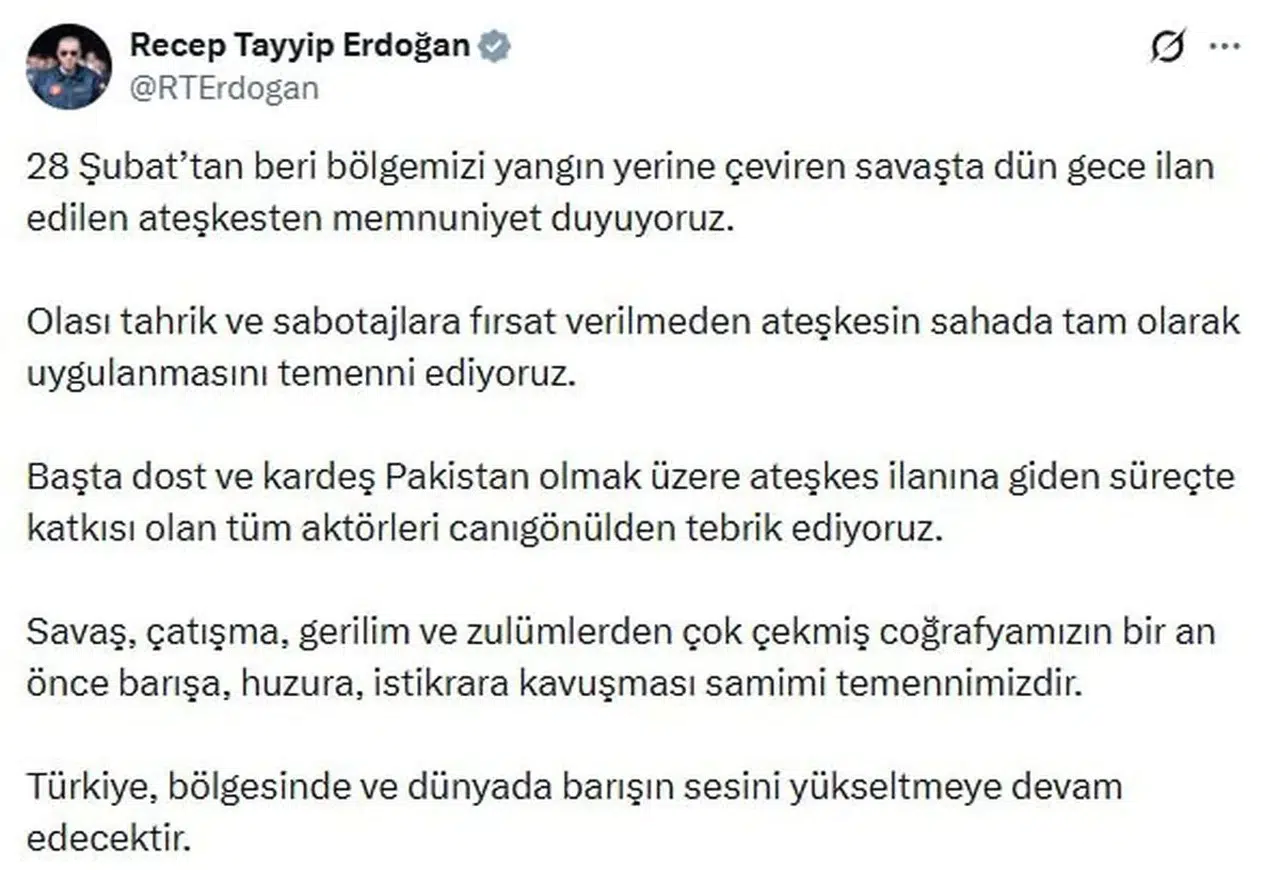 Erdoğan, ateşkes sürecine katkıda bulunan tüm tarafları tebrik ederek özellikle Pakistan’a teşekkür etti. Cumhurbaşkanı, “Başta dost ve kardeş Pakistan olmak üzere ateşkes ilanına giden süreçte katkısı olan tüm aktörleri canı gönülden tebrik ediyoruz” dedi.