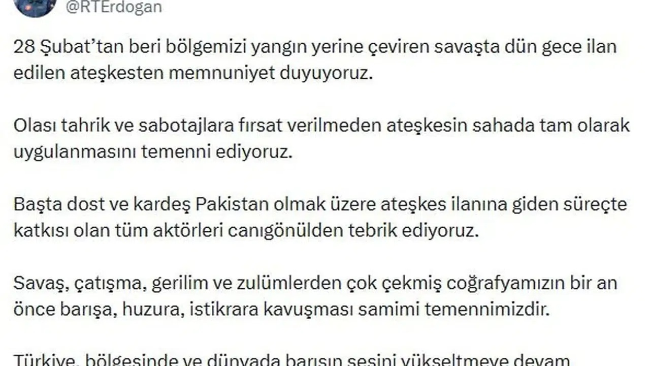 Cumhurbaşkanı Erdoğan, yaptığı açıklamada, “28 Şubat’tan beri bölgemizi yangın yerine çeviren savaşta dün gece ilan edilen ateşkesten memnuniyet duyuyoruz” ifadelerini kullandı. Erdoğan, olası tahrik ve sabotajlara fırsat verilmeden ateşkesin sahada tam olarak uygulanmasının önemine dikkat çekti.