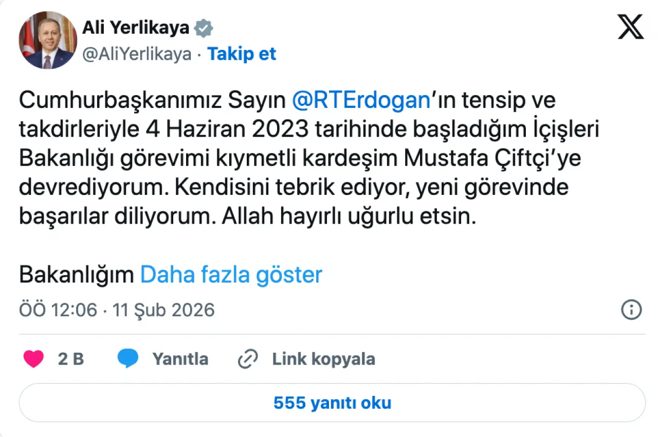 Görevini devreden Ali Yerlikaya, sosyal medya hesabından yaptığı paylaşımda, 4 Haziran 2023’te başladığı İçişleri Bakanlığı görevini Mustafa Çiftçi’ye devrettiğini açıkladı. Yerlikaya, paylaşımında Cumhurbaşkanı Erdoğan’a teşekkür ederek yeni bakana başarı dileklerini iletti ve İçişleri Bakanlığı personeline ayrı ayrı şükranlarını sundu.