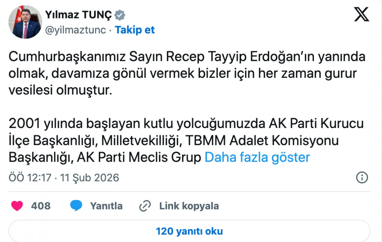 Görevinden ayrılan Yılmaz Tunç da sosyal medya üzerinden bir açıklama yaptı. Tunç, Cumhurbaşkanı Erdoğan’ın liderliğinde yürütülen reform sürecine katkı sağlamaktan onur duyduğunu belirterek, yeni Adalet Bakanı Akın Gürlek’e başarılar diledi ve bundan sonraki süreçte de Türkiye Yüzyılı hedefleri doğrultusunda çalışmaya devam edeceklerini ifade etti.