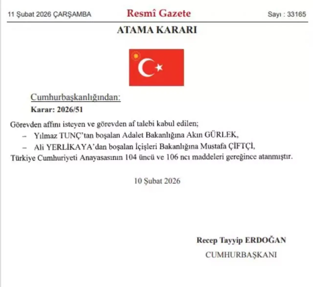 Cumhurbaşkanı Erdoğan’ın imzasını taşıyan Atama Kararı’nda, görev değişikliklerine ilişkin hukuki çerçeve de açıklandı. Kararda, görevden affını isteyen ve af talebi kabul edilen isimlerin ardından yeni atamaların, Türkiye Cumhuriyeti Anayasası’nın 104’üncü ve 106’ncı maddeleri uyarınca yapıldığı belirtildi. Buna göre Adalet Bakanlığı’na Akın Gürlek, İçişleri Bakanlığı’na Mustafa Çiftçi atandı.