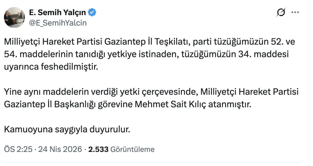 “Milliyetçi Hareket Partisi Gaziantep İl Teşkilatı, parti tüzüğümüzün 52. ve 54. maddelerinin tanıdığı yetkiye istinaden, tüzüğümüzün 34. maddesi uyarınca feshedilmiştir. Yine aynı maddelerin verdiği yetki çerçevesinde, Milliyetçi Hareket Partisi Gaziantep İl Başkanlığı görevine Mehmet Sait Kılıç atanmıştır. Kamuoyuna saygıyla duyurulur.”