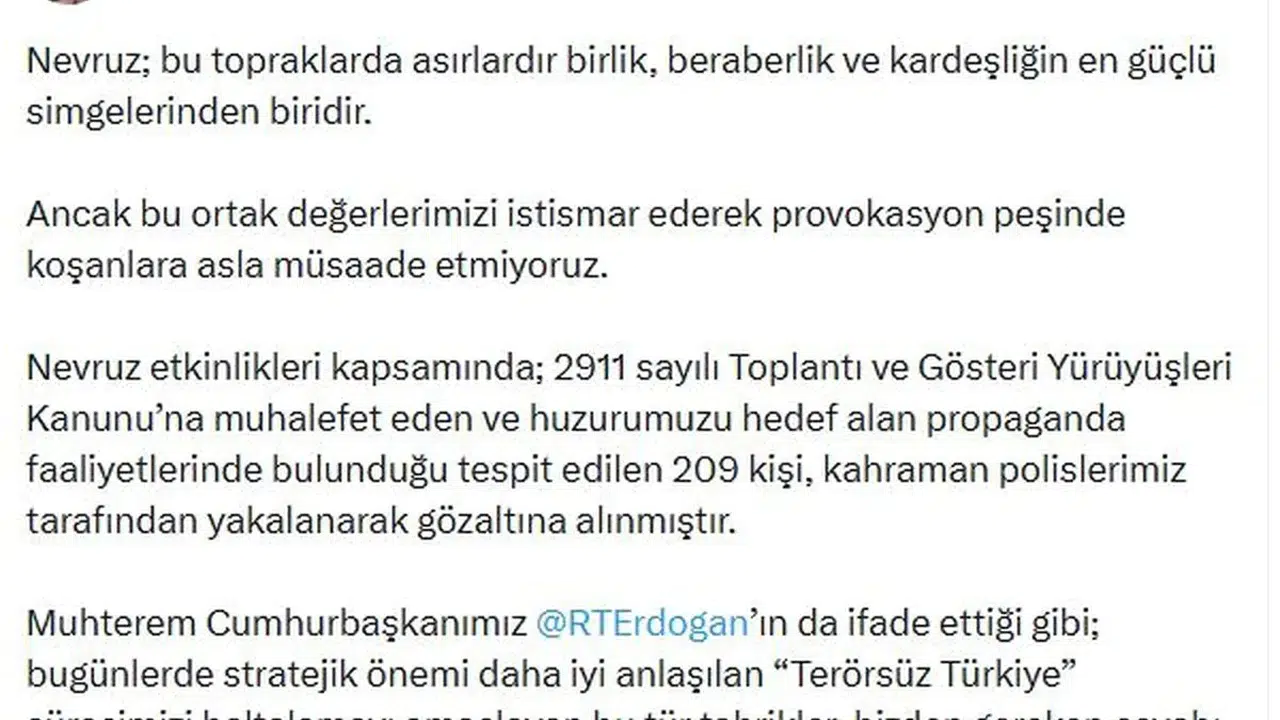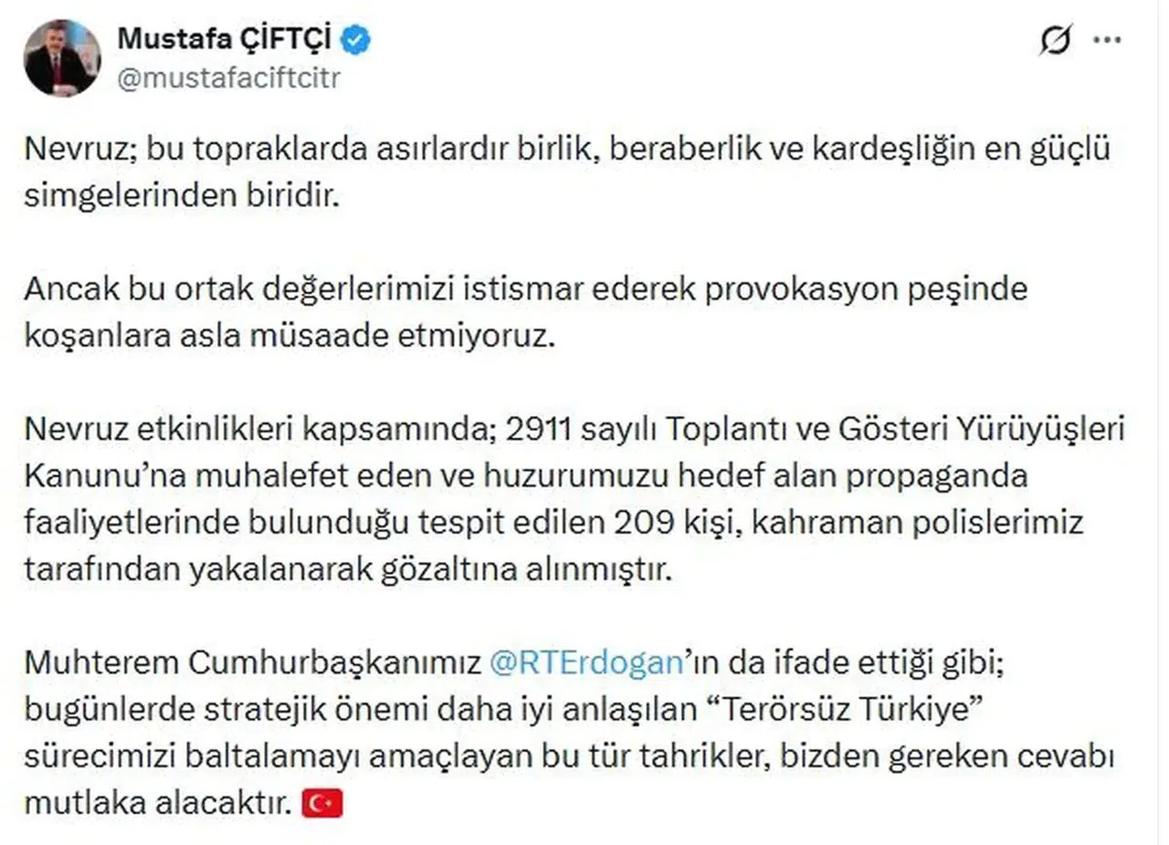İçişleri Bakanı Mustafa Çiftçi, konuya ilişkin yaptığı değerlendirmede Nevruz’un birlik ve beraberliğin simgesi olduğunu vurguladı. Ancak bu değerlerin istismar edilmesine izin verilmeyeceğini belirten Çiftçi, güvenlik güçlerinin kararlı şekilde görevini sürdürdüğünü söyledi.