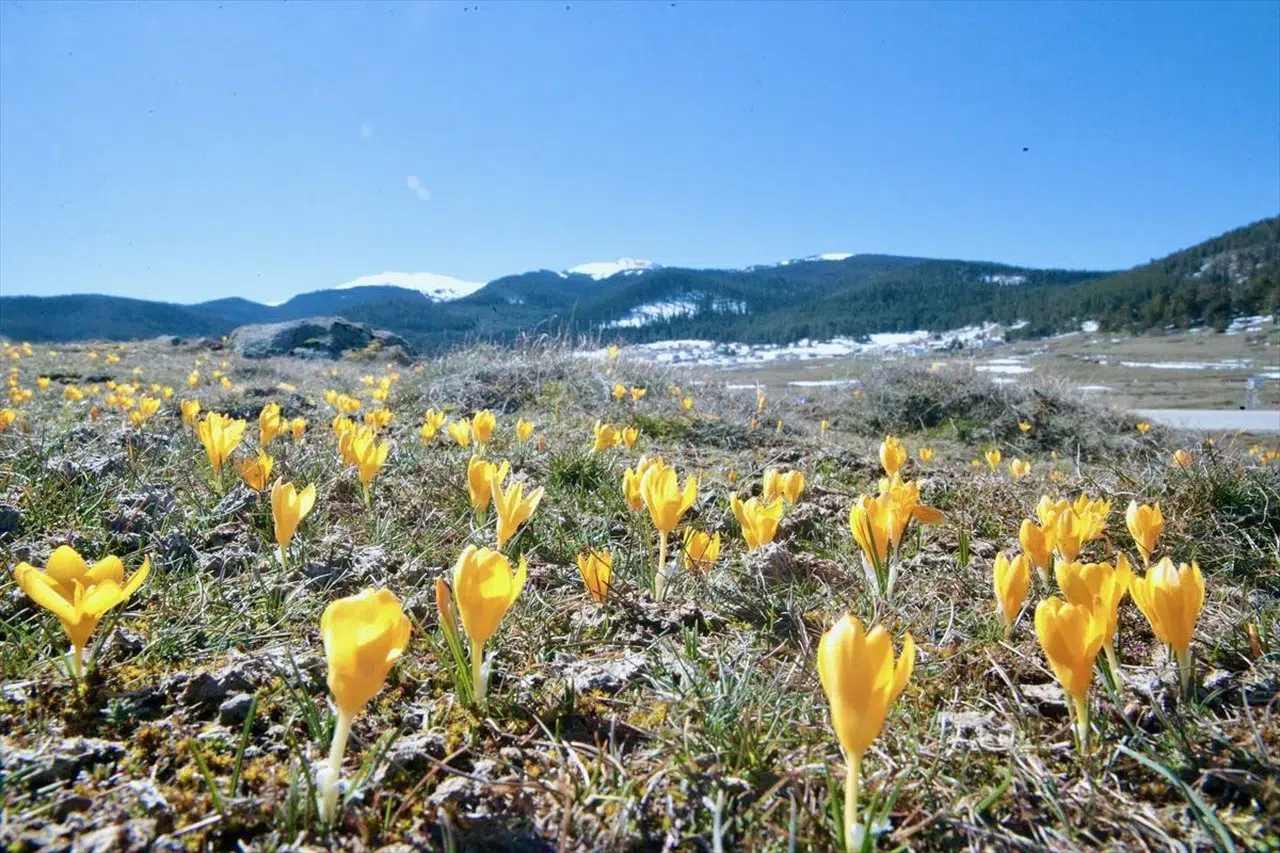Karların çekildiği alanlarda ortaya çıkan sarı ve mor çiğdemler, yaylaya adeta bir renk cümbüşü kattı. Yüksek kesimlerde hâlâ varlığını koruyan kar örtüsü, çiğdemlerle birleşerek ziyaretçilere unutulmaz bir görsel şölen sundu.