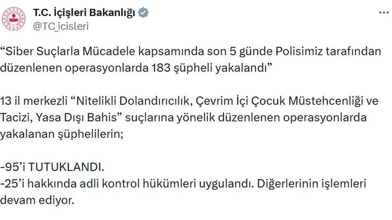 İçişleri Bakanlığı, siber suçlarla mücadele kapsamında yürütülen operasyonlarda son 5 günde önemli sonuçlar elde edildiğini duyurdu. Türkiye genelinde 13 ilde düzenlenen operasyonlarda 183 şüpheli yakalanırken, 95’i tutuklandı.