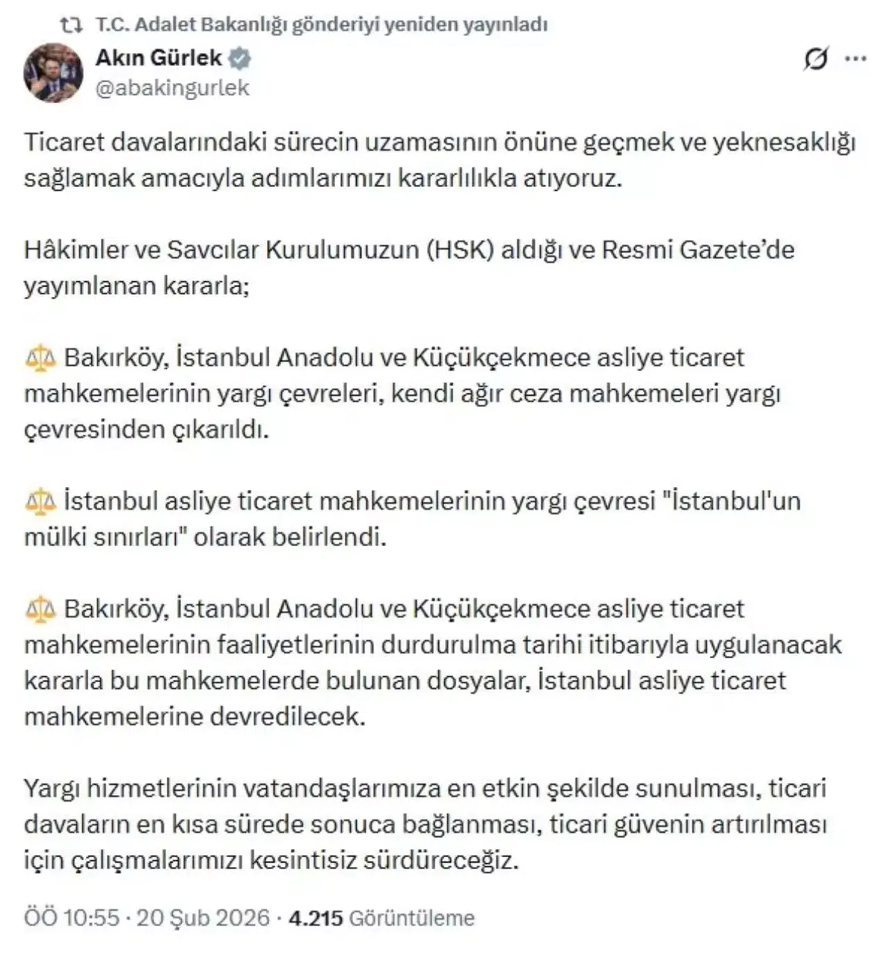 Akın Gürlek, ticaret davalarının daha hızlı sonuçlanması ve yargı hizmetlerinde etkinliğin artırılması amacıyla önemli bir düzenlemeyi duyurdu. Hakimler ve Savcılar Kurulu (HSK) tarafından alınarak Resmi Gazete’de yayımlanan kararla, İstanbul’daki bazı asliye ticaret mahkemelerinin yargı çevrelerinde değişikliğe gidildi.