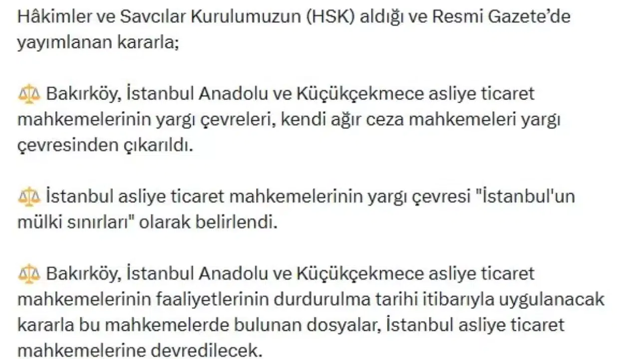 HSK kararı kapsamında; Bakırköy, İstanbul Anadolu ve Küçükçekmece asliye ticaret mahkemelerinin yargı çevreleri, kendi ağır ceza mahkemeleri yargı çevresinden çıkarıldı. Yeni düzenlemeyle İstanbul asliye ticaret mahkemelerinin yargı çevresi “İstanbul’un mülki sınırları” olarak belirlendi.