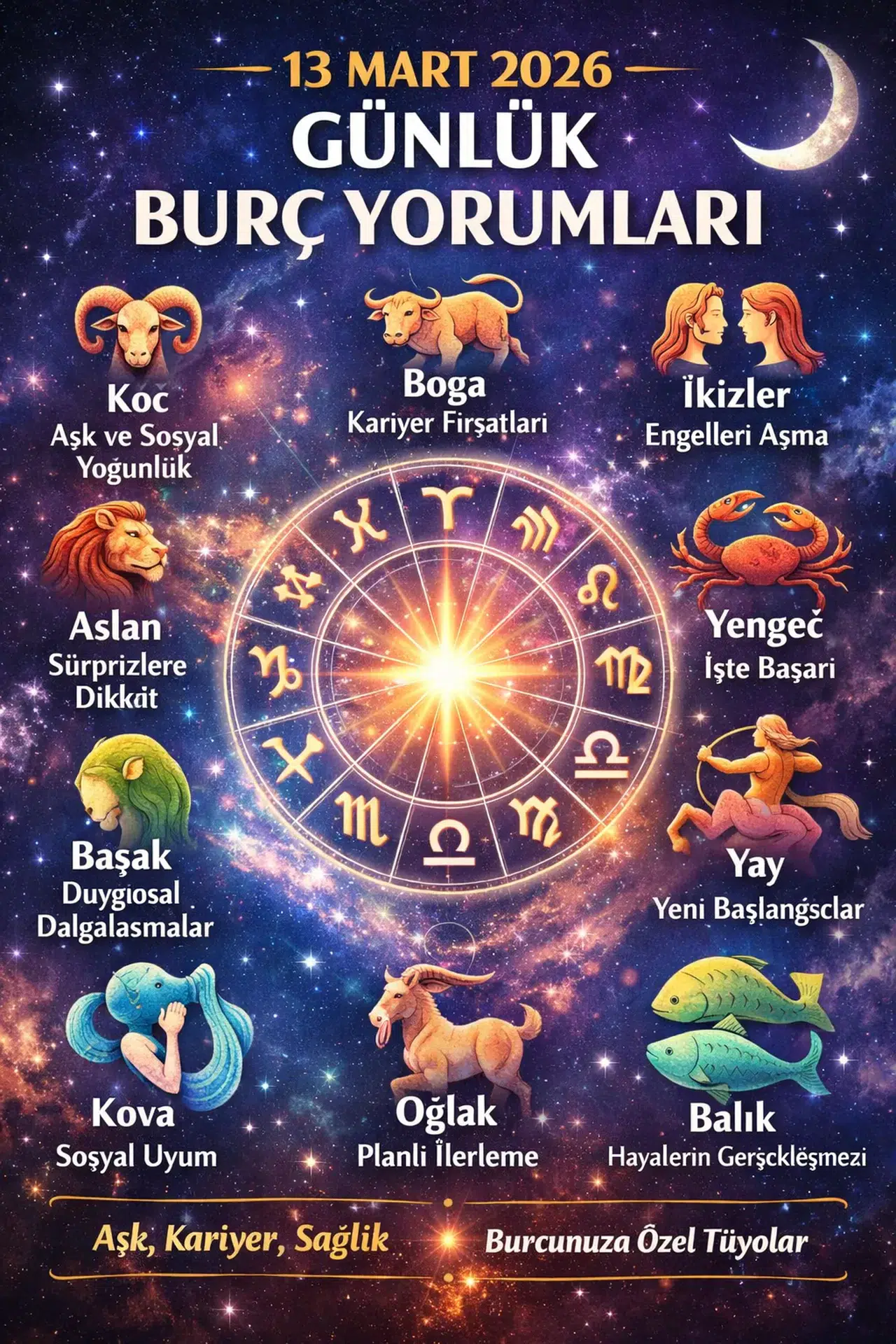 13 Mart 2026 günlük burç yorumları astroloji meraklılarının gündeminde. Haftalık ve aylık analizlerle birlikte özellikle bugün için yapılan değerlendirmeler; aşk, iş, para ve sağlık konularında ipuçları sunuyor. Koç’tan Balık’a 12 burcun 13 Mart yorumları, yeni kararlar almak isteyenler için yol gösterici nitelikte.