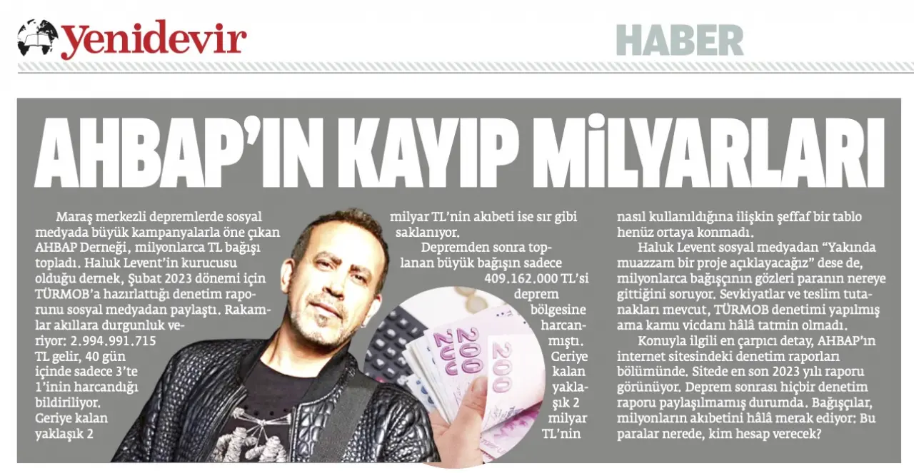 Maraş merkezli depremlerde sosyal medyada büyük kampanyalarla öne çıkan AHBAP Derneği, milyonlarca TL bağışı topladı. Haluk Levent’in kurucusu olduğu dernek, Şubat 2023 dönemi için TÜRMOB’a hazırlattığı denetim raporunu sosyal medyadan paylaştı. Rakamlar akıllara durgunluk veriyor: 2.994.991.715 TL gelir, 40 gün içinde sadece 3’te 1’inin harcandığı bildiriliyor. Geriye kalan yaklaşık 2 milyar TL’nin akıbeti ise sır gibi saklanıyor.