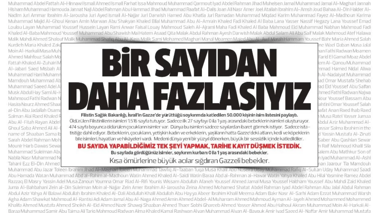 Yenidevir Gazetesi “Bir sayıdan da fazlasıyız” manşetiyle İsrail’in Gazze’de yürüttüğü soykırımda hayatını kaybeden bin 516 bebeğin isimlerini manşetine taşıdı. Sadece bu haberle birinci sayfasını kaplayan gazete, İsrail’in Gazze’de yürüttüğü soykırımda katledilen 50.000 kişi arasında yer alan 0 ila 1 yaş arasındaki 1516 bebeğin isim listesini paylaştı.