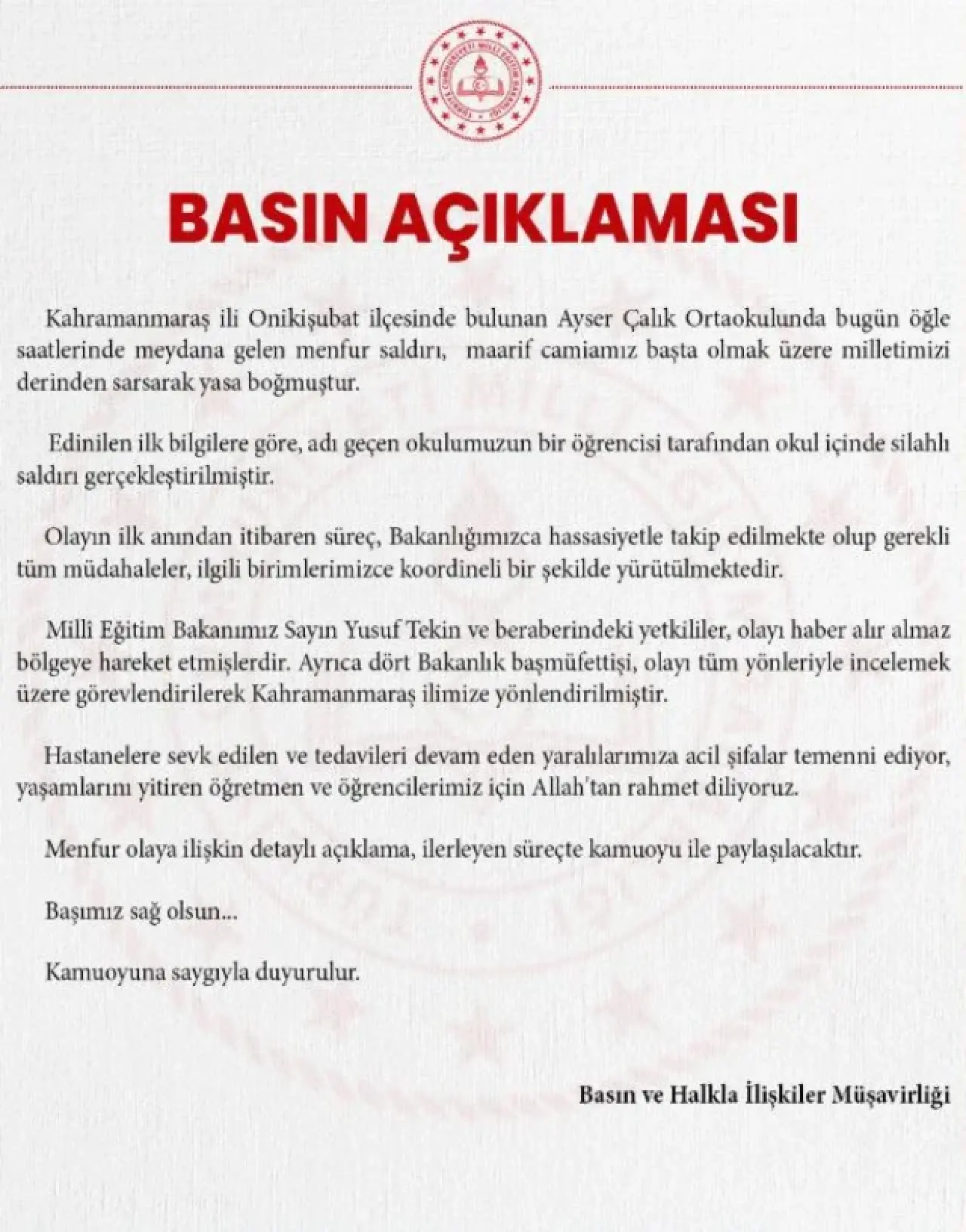 Açıklamada, olayın büyük üzüntü yarattığı belirtilirken, ilk bilgilere göre saldırının bir öğrenci tarafından gerçekleştirildiği ifade edildi. Sürecin Bakanlık tarafından hassasiyetle takip edildiği ve ilgili tüm birimlerle koordineli şekilde müdahale edildiği vurgulandı.