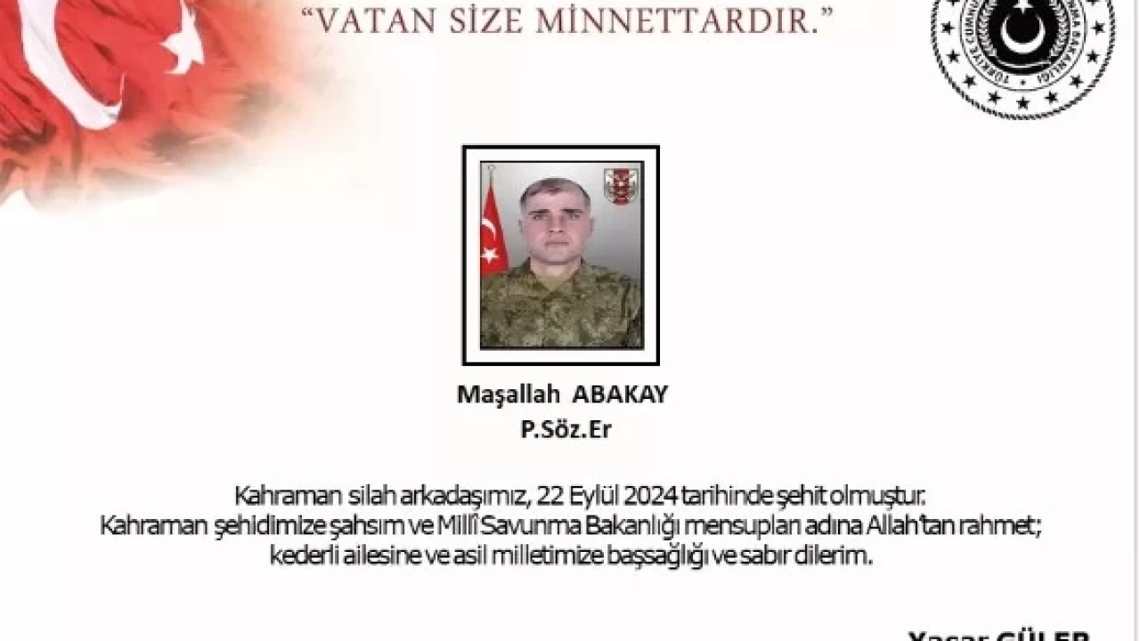 Milli Savunma Bakanı Yaşar Güler, şehit sözleşmeli er Maşallah Abakay için bir taziye mesajı yayınlayarak, "Aziz şehidimize Allah'tan rahmet, kederli ailesine sabır diliyorum" ifadelerine yer verdi.