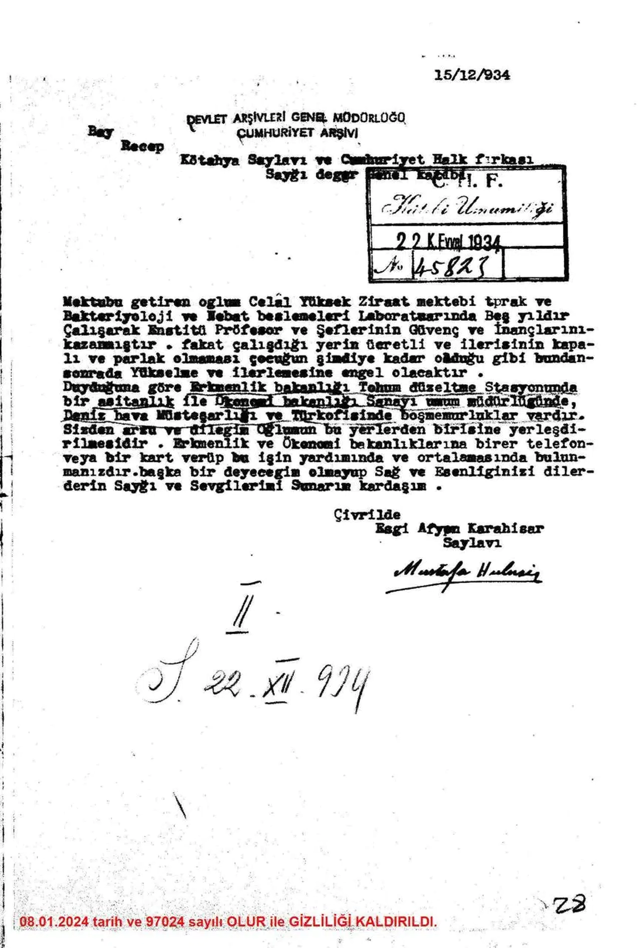 “Oğlum Celal, Yüksek Ziraat Mektebi Toprak ve Bakteriyoloji Laboratuvarında beş yıldır çalışarak profesör ve şeflerinin inançlarını kazanmıştır. Fakat çalıştığı yerin ücretli ve ilerisinin kapalı ve parlak olmaması çocuğun yükselme ve ilerlemesine engel olacaktır. Duyduğuma göre Ekonomi Bakanlığında başmemurluklar vardır. Sizden arzum ve dileğim oğlumun bu yerlerden birisine yerleştirilmesi, birer telefon veya kart verip bu işin yardımında bulunmanızdır.”