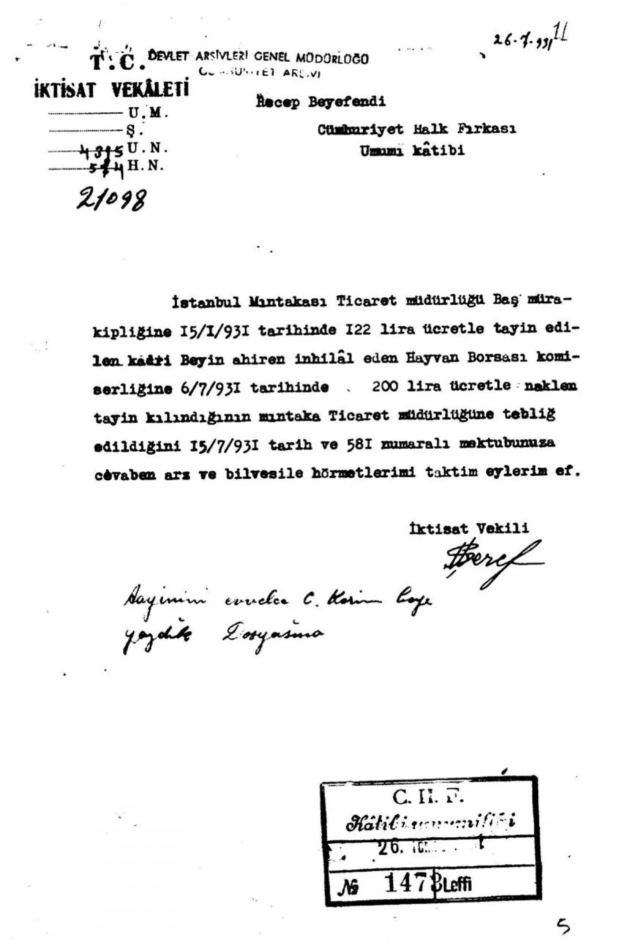 “İstanbul mıntıkası Ticaret Müdürlüğü Baş Murakıplığına 122 lira ücretle tayin edilen Kadri Bey’in, ahiren inhilal eden Hayvan Borsası komiserliğine 200 lira ücretle naklen tayin kılındığının mıntıka Ticaret Müdürlüğüne tebliğ edildiğini, mektubunuza cevaben arz ve bilvesile hürmetlerimi takdim ederim.”