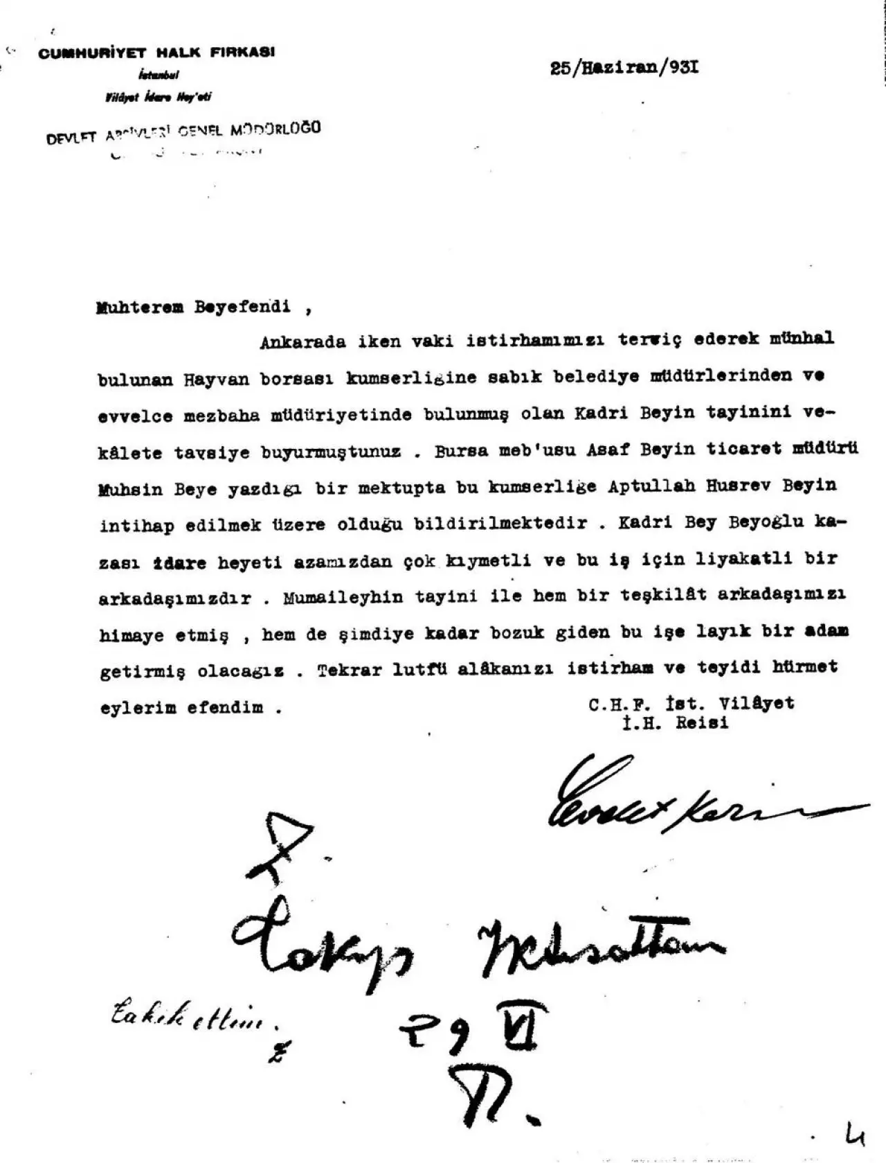 “Hayvan Borsası Komiserliğine sabık belediye müdürlerinden ve evvelce mezbahanın müdüriyetinde bulunmuş Kadri Bey’in tayinini vekâlete tavsiyede buyurmuştunuz. Kadri Bey, Beyoğlu kazası idare heyeti azamızdan çok kıymetli ve bu iş için liyakatli bir arkadaşımızdır. Tayini ile hem bir teşkilat arkadaşımızı himaye etmiş hem de şimdiye kadar bozuk giden bu işe layık bir adam getirmiş olacağız.”