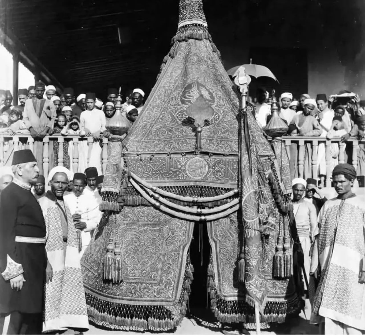 “Mahmil-i Şerif’i tekbir ve ilahilerle saraya getirip, harem dairesinin bahçesine koyarlardı. Mahmil-i Şerif bütün sultanlar, kadınefendiler ve kalfalar tarafından ziyaret olunurdu. Her sultan ve her kadınefendiye hediye olarak sırmalı ustufalar (kumaş) verilirdi. Sarayın iki eski kalfası bu kumaşlarla Mahfil-i Şerif’i süslerdi.