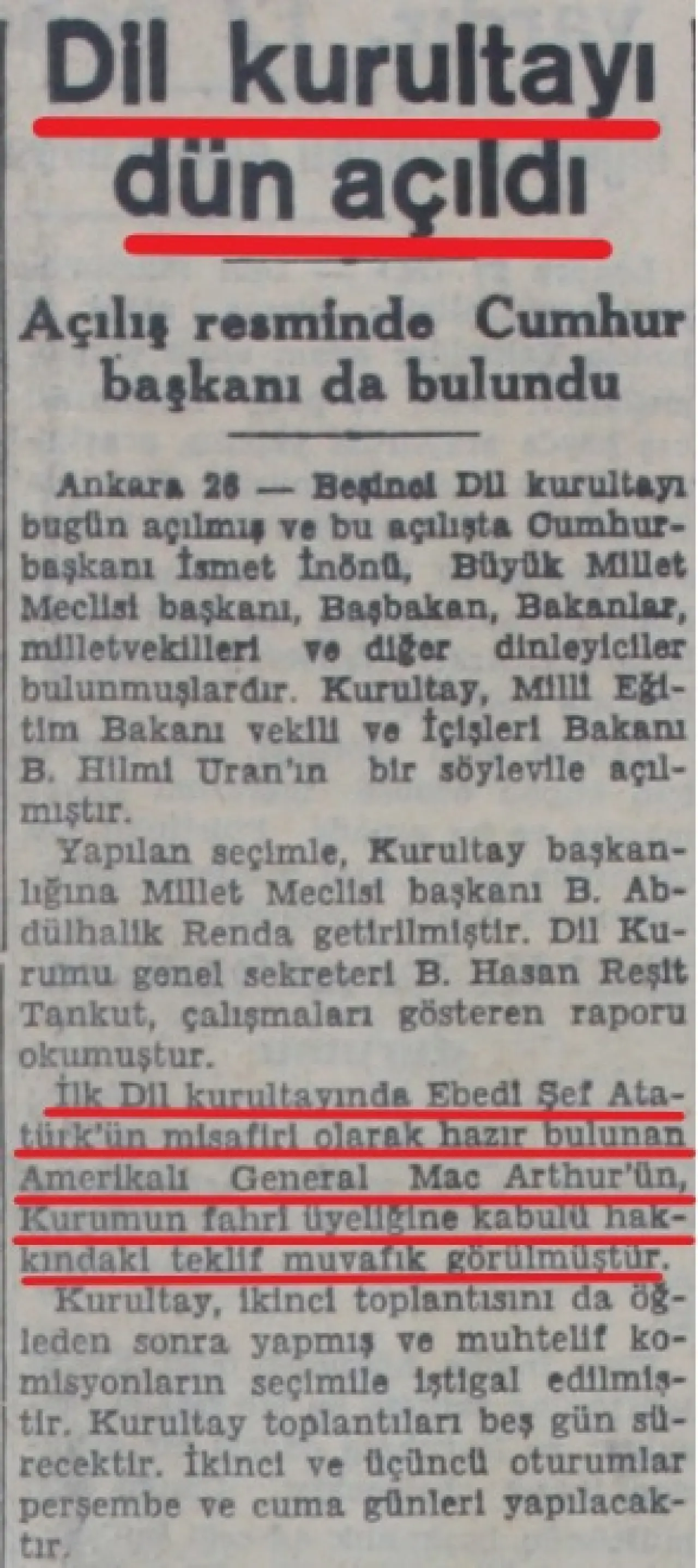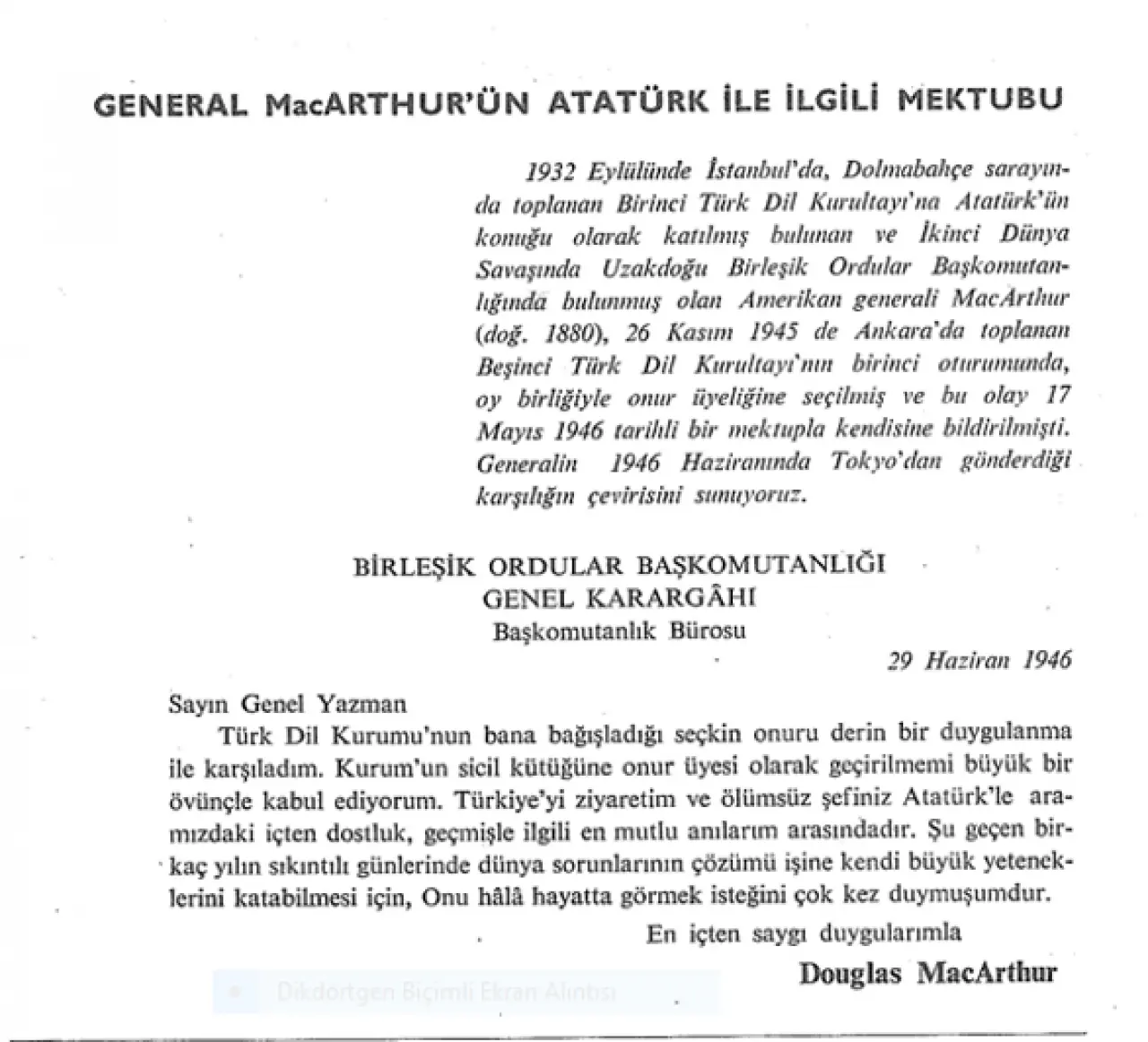 1932 Eylülünde İstanbul’da, Dolmabahçe sarayında toplanan Birinci Türk Dil Kurultayı’na Atatürk’ün konuğu olarak katılmış bulunan ve İkinci Dünya Savaşında Uzakdoğu Birleşik Ordular Komutanlığında bulunmuş olan Amerikan generali MacArthur (doğ. 1880), 26 Kasım 1945 de Ankara’da toplanan Beşinci Türk Dil Kurultayı’nın birinci oturumunda, oy birliğiyle onur üyeliğine seçilmiş ve bu olay 17 Mayıs 1946 tarihli bir mektupla kendisine bildirilmişti. Generalin 1946 Haziranında Tokyo’dan gönderdiği karşılığı çevirisini sunuyoruz.