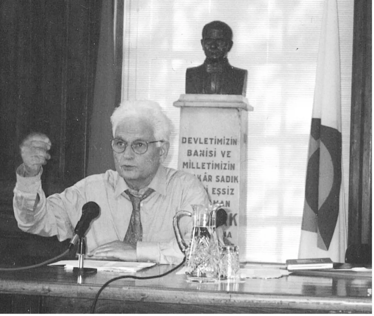 Fransız filozof Jacques Derrida Boğaziçi Üniversitesi’ndeki konferansı sırasında (1997).