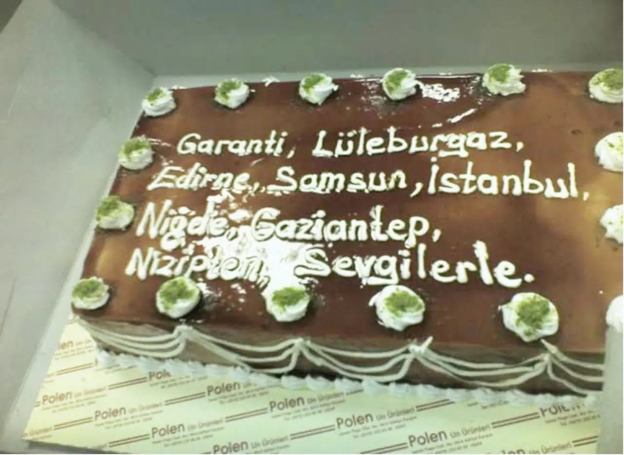 Bir gazete haberine ait bu fotoğraf. Enteresan ve gülünç hikâyesiyle dikkat çekiyor. Garanti Leasing çalışanları önemli bir kutlama davetine gönderilmek üzere pastaneyi arayıp pasta siparişi vermek ister. Pastane personeli, üzerine yazılacak sözdeki “Leasing” kelimesini anlamayınca çalışan kodlayarak yazdırır notunu ve gönül rahatlığıyla kapatır telefonu. Akşam katıldığı kutlamada pastayı görünce yaşadığı mahcubiyet ve şok tarifsizdir. Pastanecinin kendisini yanlış anladığını izah etmeye çalışır; fakat nafile, sonuç ortadadır.