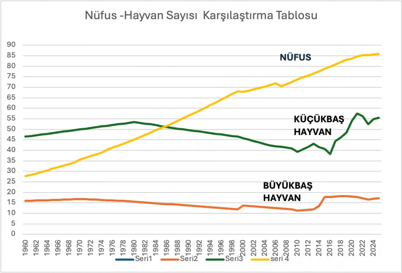 Türkiye’de 1960 ile 2025 yılları arasındaki hem küçükbaş hem de büyükbaş hayvanların sayılarını TÜİK verilerine göre incelediğimizde karşımıza şöyle bir tablo çıkıyor;