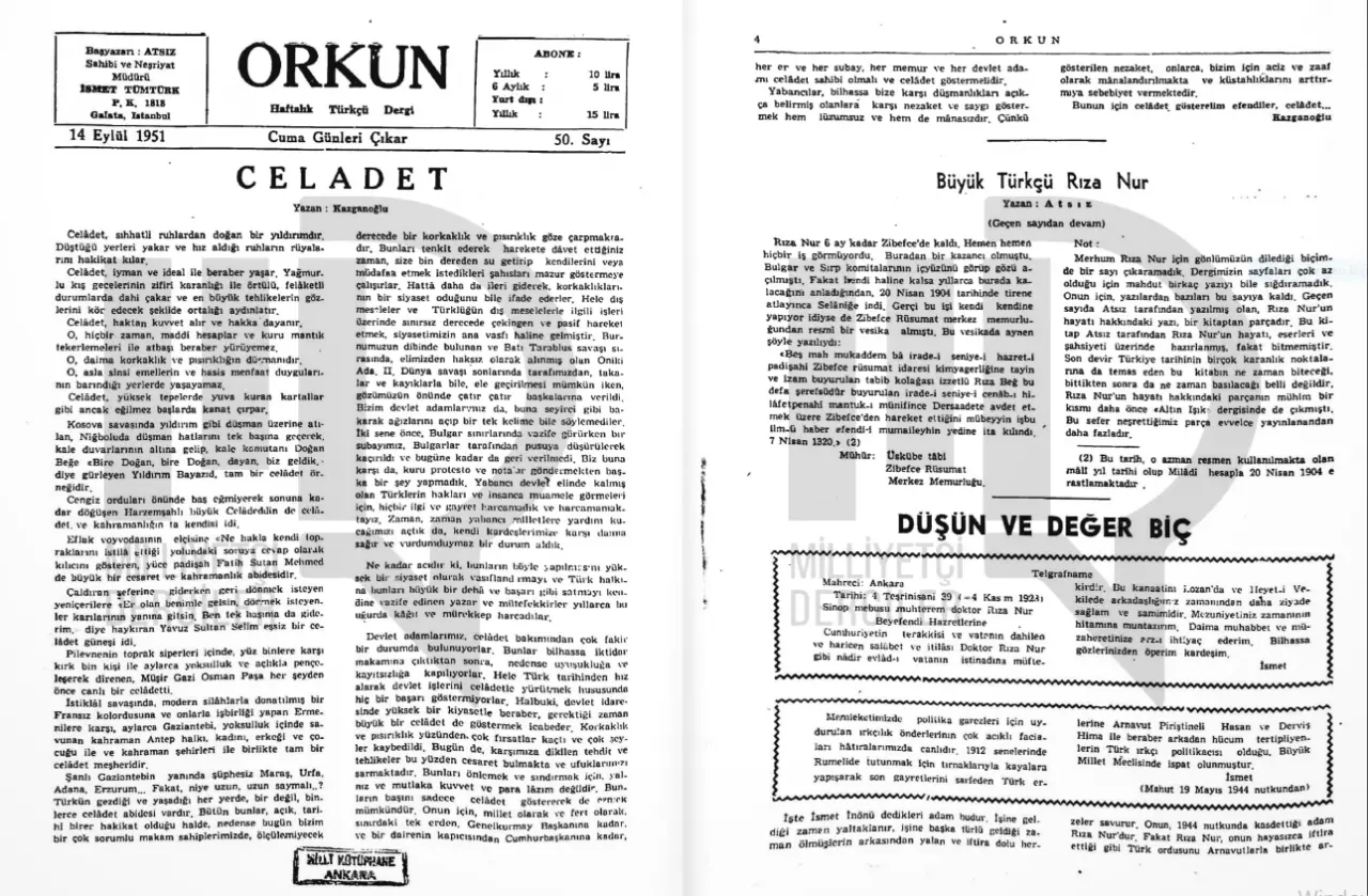 Kazganoğlu, “Celadet”, Orkun, Sayı: 50, 14 Eylül 1951, s. 3-4. (Kazganoğlu, Türkeş’in subaylık yıllarında kullandığı takma ismidir.)