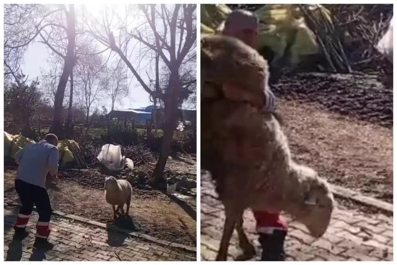 51 yaşındaki Nazmi Kahveciler, hayvanlarına yem verdiği sırada koçla güç denediği anları sosyal medya hesabından paylaştı. Kahveciler, paylaşımına şu notu düştü: