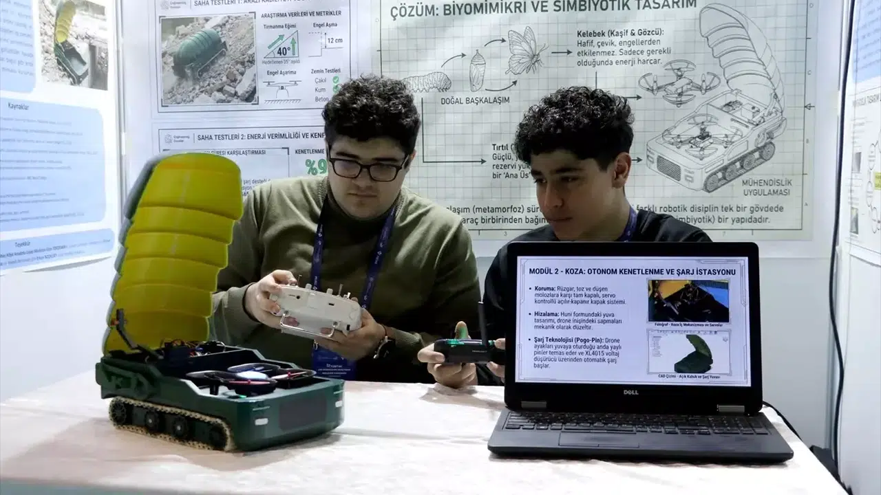Osman Ulubaş Köşk Anadolu Lisesi’nden Efe Özbey Akgül ve Fen Bilimleri Anadolu Lisesi’nden Mehmet Karaağaç, doğal bir ilhamla projelerine başladıklarını söyledi. Tırtılın kelebeğe dönüşümünü tasarımlarına aktaran öğrenciler, afet bölgelerinde zorlu noktalara ulaşabilecek bir robot geliştirdi.